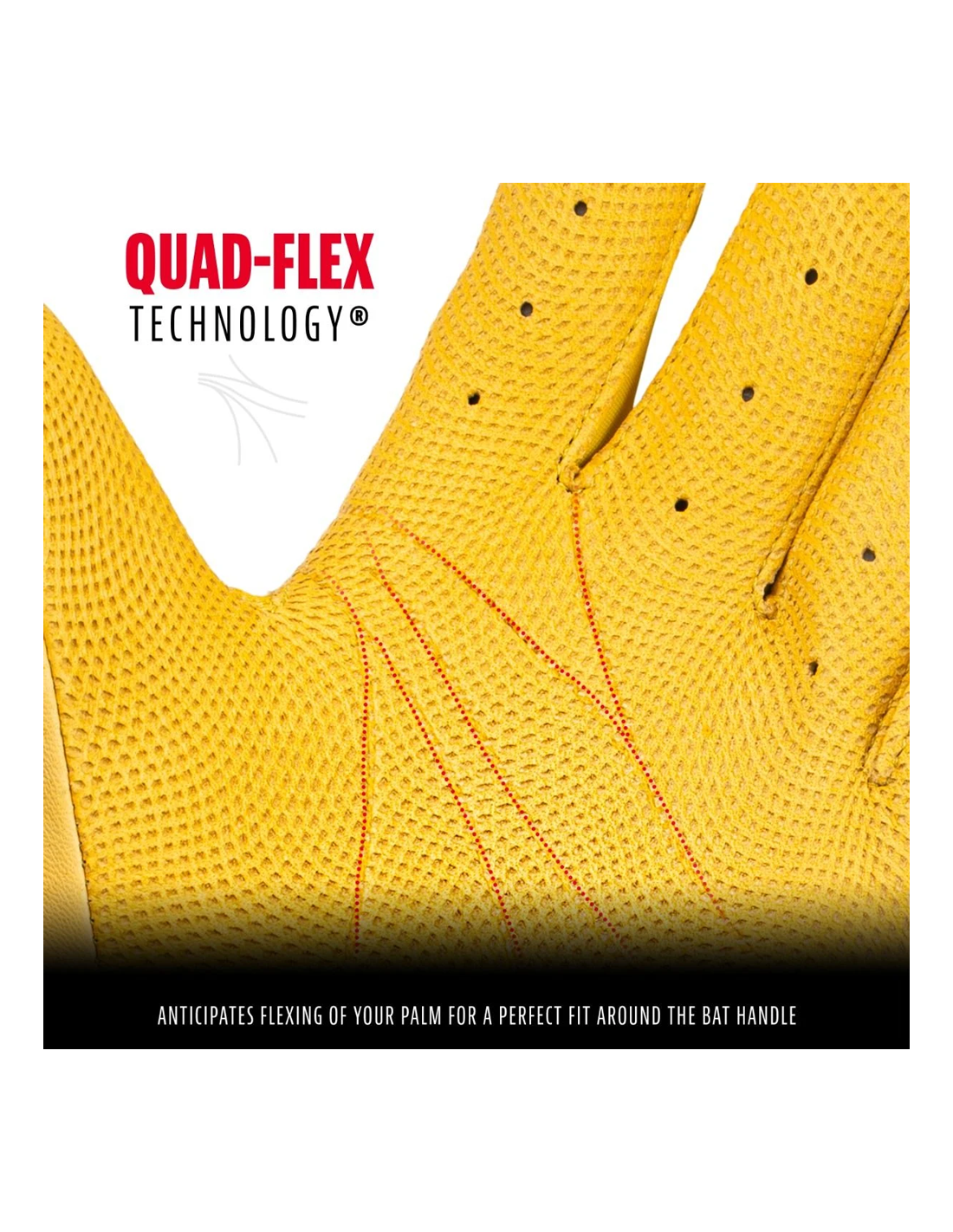 QUAD-FLEX TECHNOLOGY®: Előre jelzi a tenyér hajlítását, hogy tökéletesen illeszkedjen az ütőmarkolat köré.