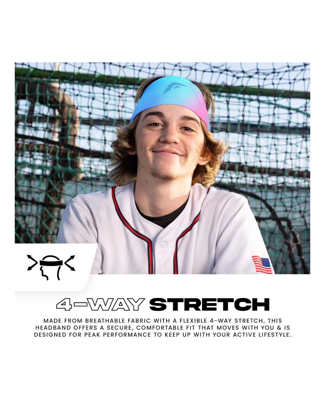 - BANDA DESPORTIVA: Concebida para jogadores de basebol e softbol, esta faixa desportiva é perfeita para todos os atletas que procuram ter o melhor aspeto e desempenho durante o exercício, a corrida, a prática de desportos e muito mais!